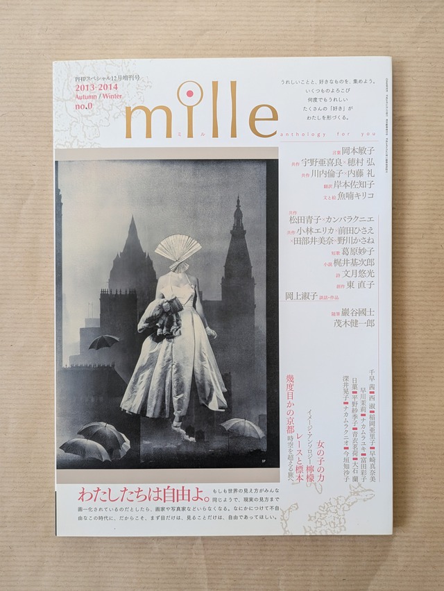白地に岡上淑子のコラージュと金色のタイトル、そして「わたしたちは自由よ」の言葉が印象的な表紙。めくれば「美と知と抒情を愛する人へ」とある。 女の子のお気に入りを集めたコレクションボックスのような、美しいもの、可愛いもの、不思議なもの、少しエロティックなもの、懐かしいものなど感性を揺さぶるものが詰めこまれている。著者も面白い面々ばかり。 「no.0」とあり定期的な発刊が期待されたが、この号以降発刊されていない。 ◯宇野亜喜良◯穂村弘◯川内倫子◯内藤レイ◯松田青子◯カンバラクニエ◯茂木健一郎◯千早茜◯西淑◯早川茉莉◯葛原妙子◯文月悠光◯稲岡亜里子 ほか ■丹所千佳 編 ■PHP研究所/2013年11月初版 ■ペーパーバック/25.7×18.3×0.7cm/96p. ■状態:良 表紙に経年によるクスミやスレがあるものの、ヨゴレやイタミなく、本文も綺麗な状態です。