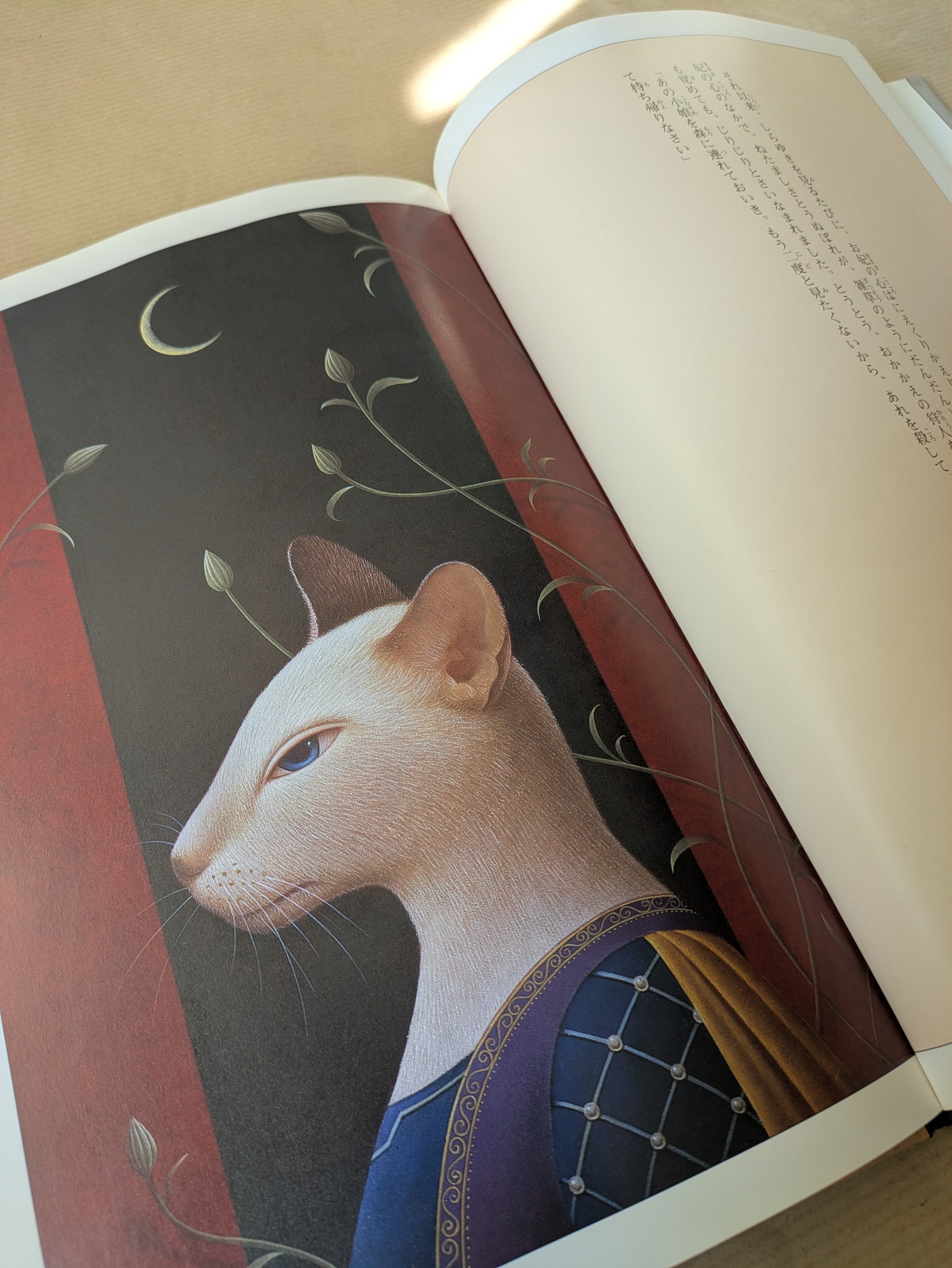 テンペラと油彩を併用した、きめの細かい繊細な技法が、クラシカルで幻想的なキャラクターと絶妙に合わさり美しくも不思議な物語世界を生み出している。