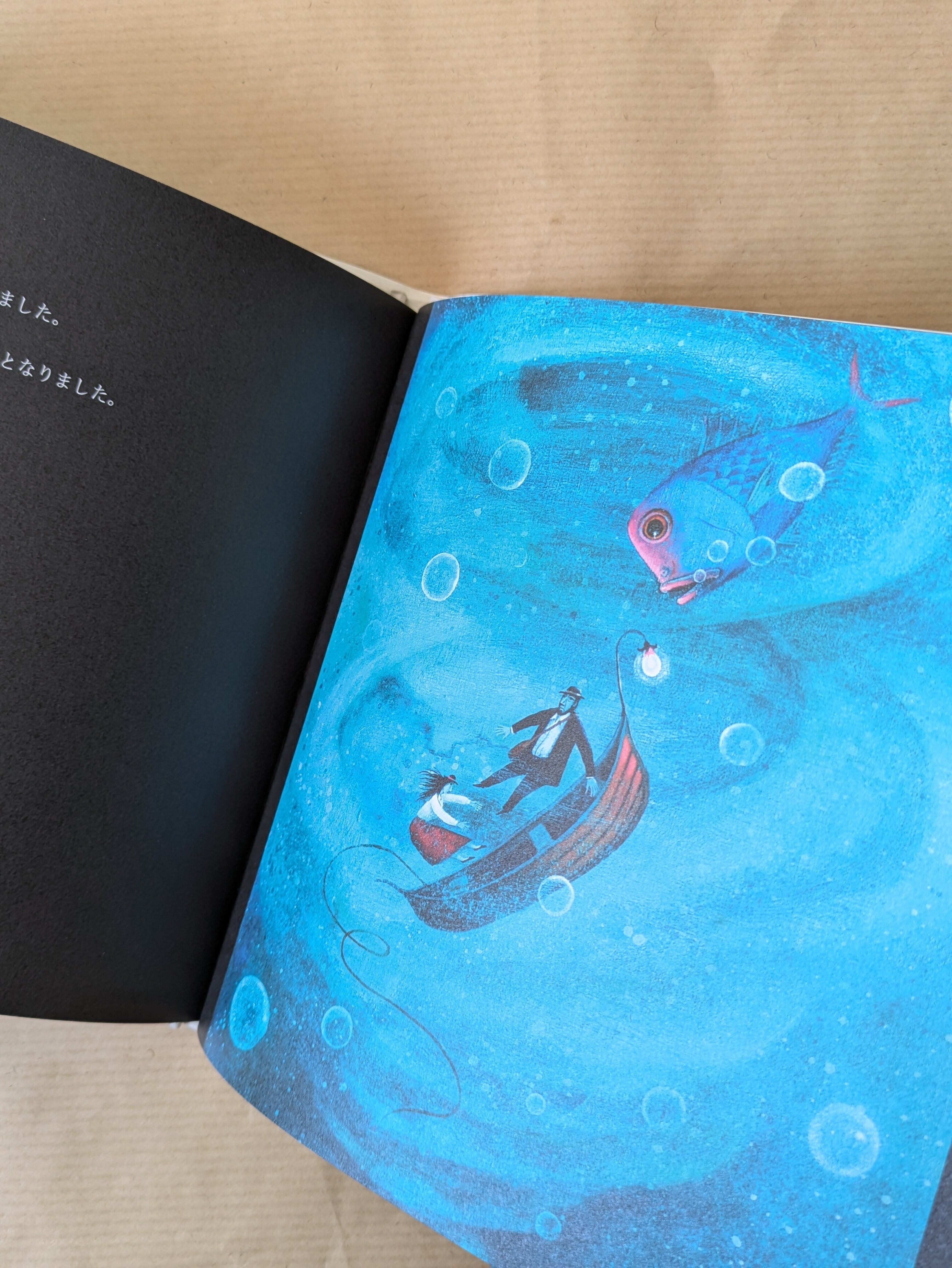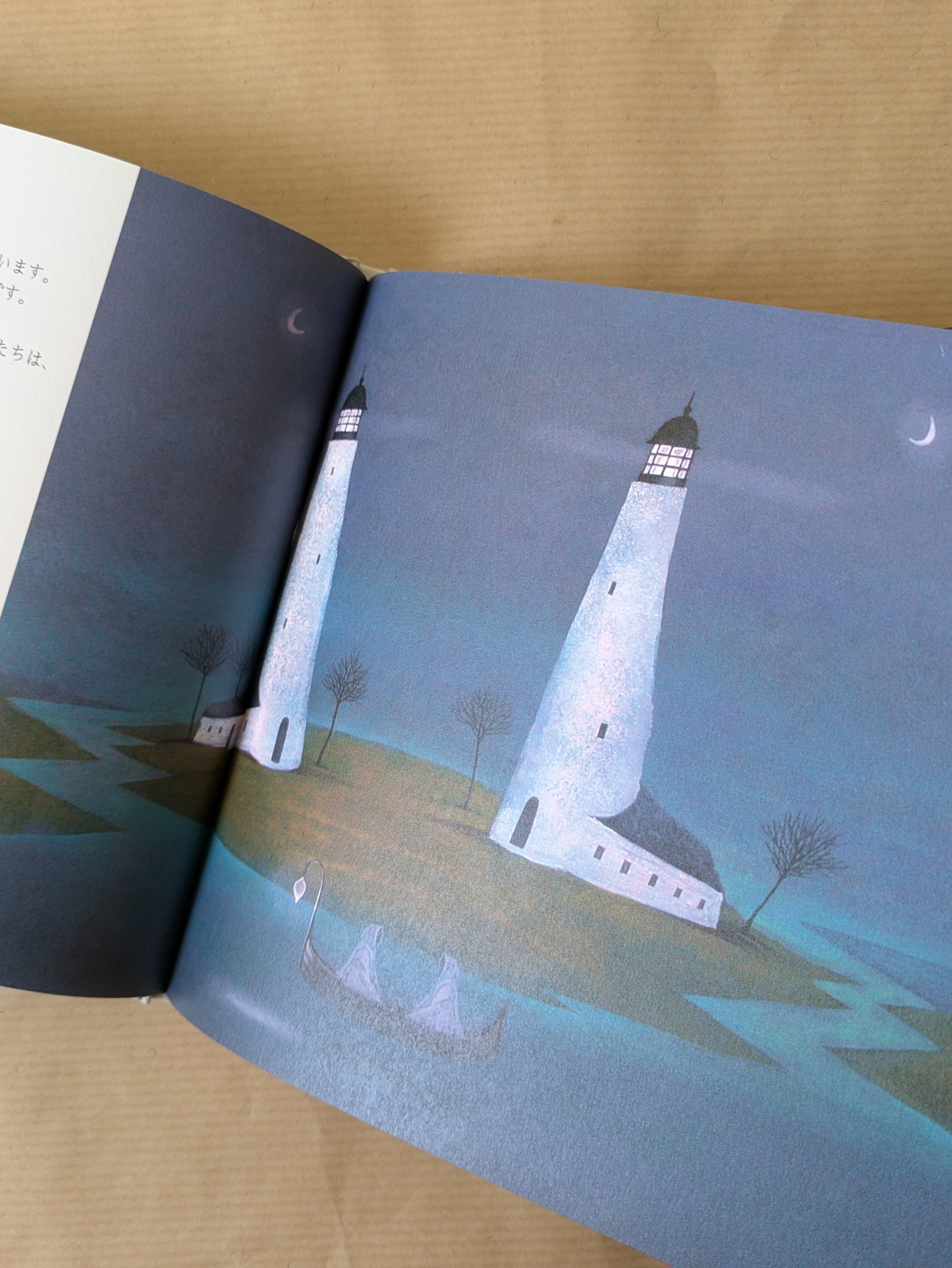本作は、2006年にボローニャ国際絵本原画展入選作品を再構成したものである。夜の青、水の青、そして所々に効かせた赤が印象的な静かで幻想的な作品である。冒険譚でありながらあくまで淡々と進む物語は好みの分かれそうなところではあるが、インパクトの強い絵と後から付けたような文章の組み合わせは、パロル舎の小型サイズの絵本シリーズでよくある手法である。