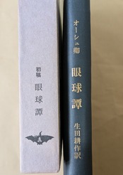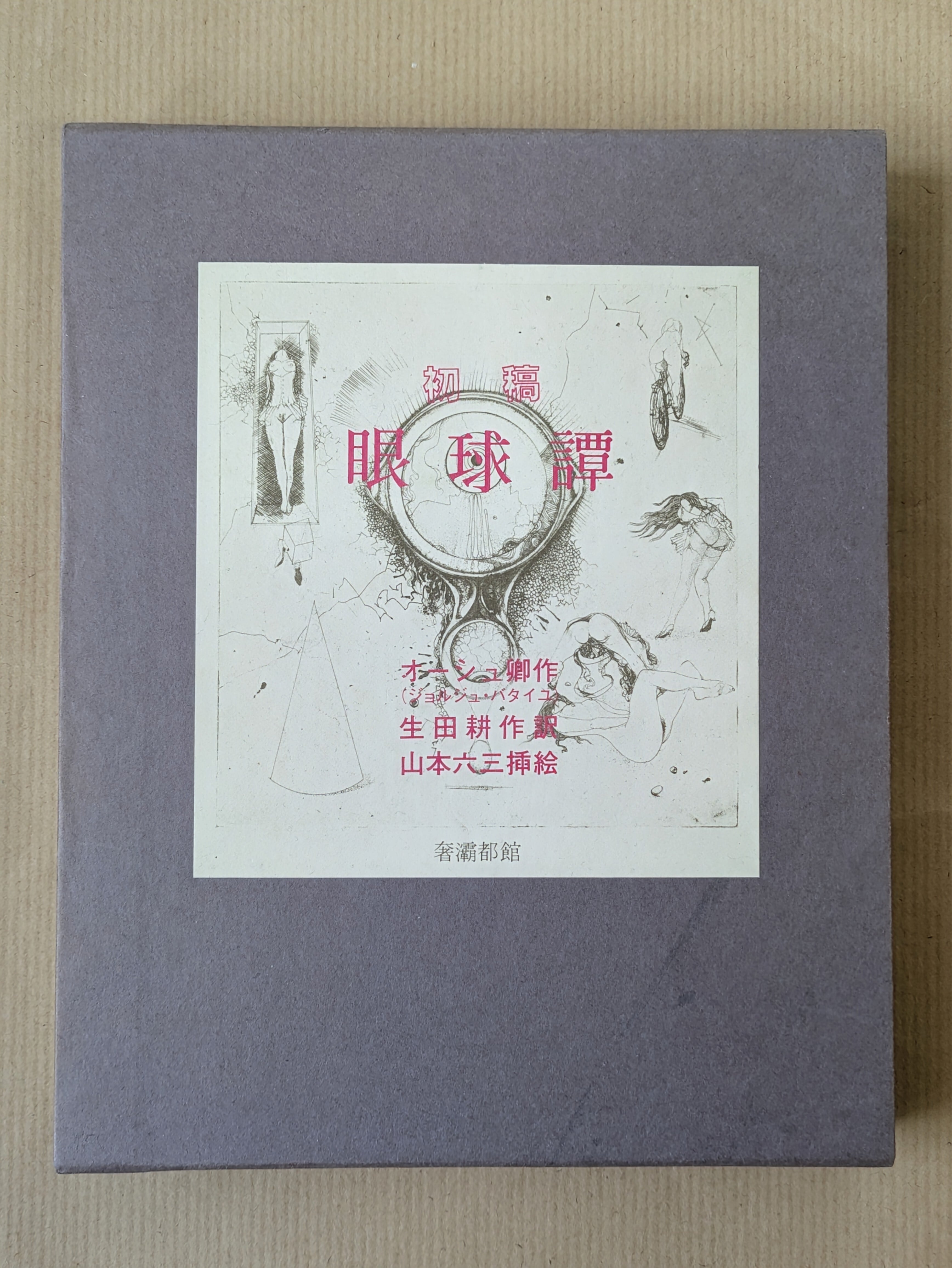 フランスの哲学者・思想家・作家であるオーシュ卿(ジョルジュ・バタイユ)の「初稿 眼球譚 」翻訳を手がけた生田耕作の奢灞都館(サバト舘)から1977年に発行された。挿絵は山本六三。初刷1000部発行の1冊。